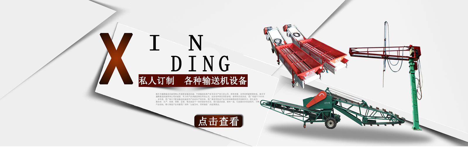 衡水市鑫鼎輸送機械有限公司是糧食輸送機械、平板輸送機等產品專業生產加工的公司,擁有完整、科學的質量管理體系。衡水市鑫鼎輸送機械有限公司的誠信、實力和產品質量獲得業界的認可。歡迎各界朋友蒞臨參觀、指導和業務洽談。 我廠創建于1980年,多年來,我廠致力于糧食輸送機械系列產品的生產和開發。我廠具有優良的產品開發和雄厚的技術創新實力,使之成為集科研、生產、檢測、銷售、安裝、售后服務于一體的綜合性企業,我們追求卓越,崇尚一流,引進國內外先進技術,不斷產品結構,精心鑄造產品質量我廠堅持“以誠為本,優質服務”的經營理念。。積極拓展市場,贏得了廣大客戶的信賴和一致好評。產品暢銷山西、山東、遼寧、黑龍江、吉林、北京、天津、內蒙古等28個省、市、自治區。